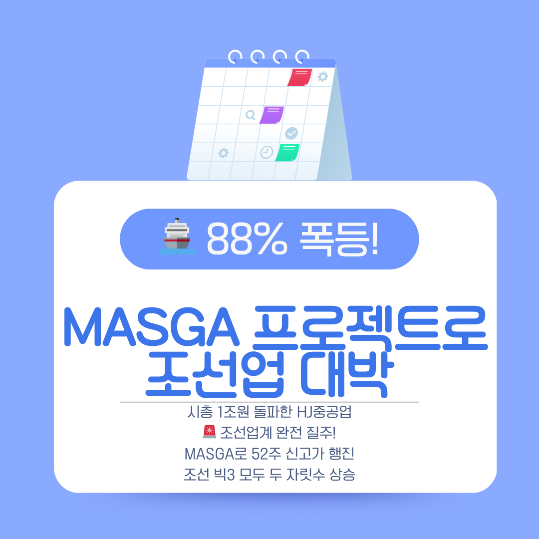 📌 핵심 요약: 한미 차세대 해양기술 협력 'MASGA 프로젝트' 본격화로 조선업계 전면 상승세, HJ중공업 한 달간 88% 급등하며 시총 1조원 돌파🔥 조선업계에 불어닥친 완벽한 폭풍숫자로 보는 충격적 상승률조선 빅3 한 달간 수익률:한화오션: 53.4% ↗ (7만6700원 → 11만7700원)HD한국조선해양: 13.9% ↗ (32만500원 → 36만5000원)삼성중공업: 11.7% ↗ (1만7320원 → 1만9340원)부산 조선업체 돌풍:HJ중공업: 88.3% ↗ (7450원 → 1만4010원) - 52주 신고가 경신오리엔탈정공: 53.9% ↗ (5290원 → 8140원) - 하루 27.9% 급등💥 시장을 뒤흔든 두 가지 핵심 동력🌟 게임 체인저: MASGA 프로젝트의 모든 것🎯 MASGA가..