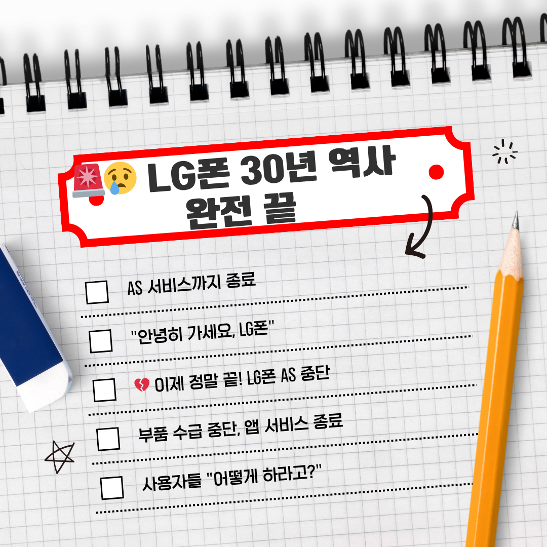 🏷️ 태그: #LG전자스마트폰종료 #LG폰AS중단 #30년역사마감 #휴대폰사업철수 #23분기연속적자 #5조원누적손실 #LG벨벳마지막 #스마트폰시장퇴출 #사후서비스종료 #모바일사업실패