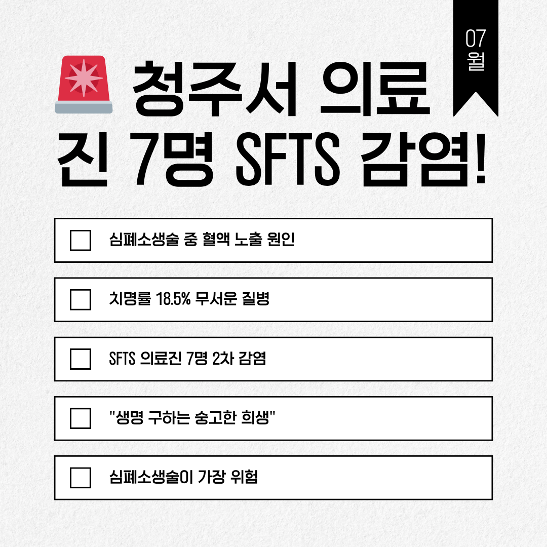 📌 핵심 요약: 충북 청주 상급종합병원에서 SFTS 환자 치료 중 의료진 7명 2차 감염, 심폐소생술 시 혈액·체액 노출이 원인