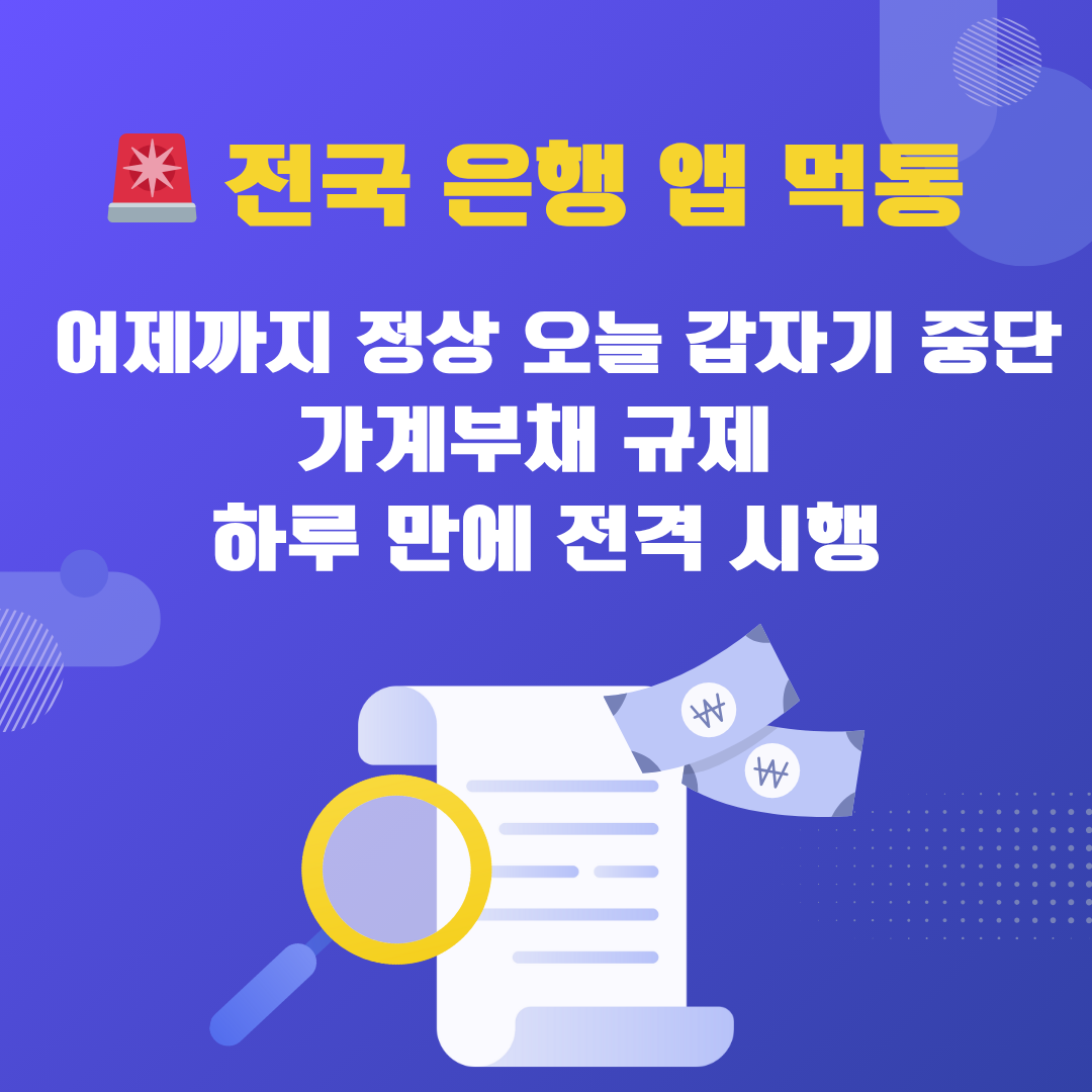 📌 핵심 요약: 정부 가계부채 관리방안 발표 하루 만에 전 금융권 시스템 마비, 실수요자까지 피해 확산🔥 지금 무슨 일이? 은행가의 대혼란어제까지만 해도 정상이었던 은행 앱이 오늘 갑자기 먹통이 됐습니다.정부가 27일 발표한 '가계부채 관리 강화방안'이 28일부터 전격 시행되면서, 전국 시중은행과 2금융권의 비대면 대출 접수가 일제히 중단되는 초유의 사태가 벌어지고 있습니다.국민은행을 제외한 거의 모든 시중은행이 온라인 대출 서비스를 중단했고, 인터넷은행과 지방은행, 2금융권까지 도미노처럼 서비스 중단이 이어지고 있습니다.💰 무엇이 바뀌었나? 새로운 대출 규제의 모든 것🏠 주택담보대출 대폭 축소수도권·규제지역 주담대 한도: 6억원으로 제한기존 9억~10억원에서 대폭 축소대출 받으면 6개월 이내 무..